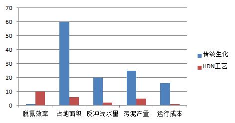 新興HDN工藝對(duì)這些缺陷進(jìn)行深入研究后,對(duì)各個(gè)環(huán)節(jié)進(jìn)行改進(jìn),實(shí)現(xiàn)了池體容積、脫氮效率、運(yùn)行成本等多方面的突破,對(duì)比如下: